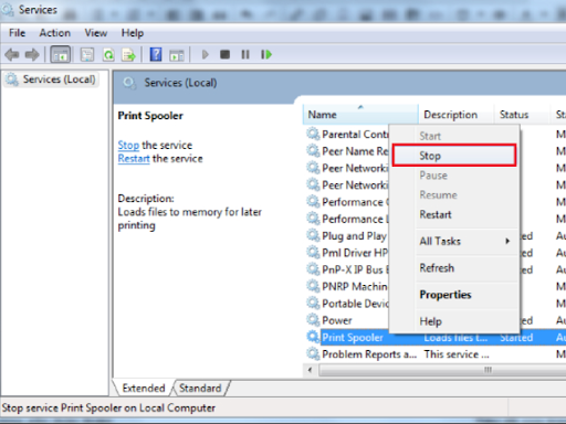 - Bước 2: Hộp thoại Print Spooler xuất hiện sau. Click chuột vào “ Stop” để dừng lệnh in tức thời.