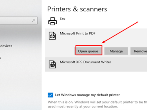 - Bước 2: Tại “Printer and Scanners”, chọn máy muốn hủy lệnh in; sau đó nhấn nút “Open queue” để hoàn tất.