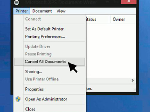 - Bước 3: Cửa sổ hiển thị các tệp đang in, bạn nhấn chuột phải vào tag “Printer”, và chọn “Cancel All Document”.