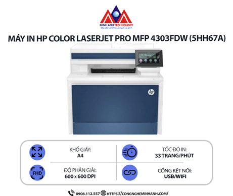 HP Color LaserJet Pro MFP 4303fdw là giải pháp lý tưởng cho văn phòng hiện đại: in màu đẹp, scan tài liệu nhanh, fax tiện lợi và copy sắc nét – tất cả tích hợp trong một thiết bị nhỏ gọn, tiết kiệm không gian. Hãy để Công nghệ Minh Anh Quận 7 đồng hành cùng bạn trong việc xây dựng môi trường làm việc chuyên nghiệp và hiệu quả.