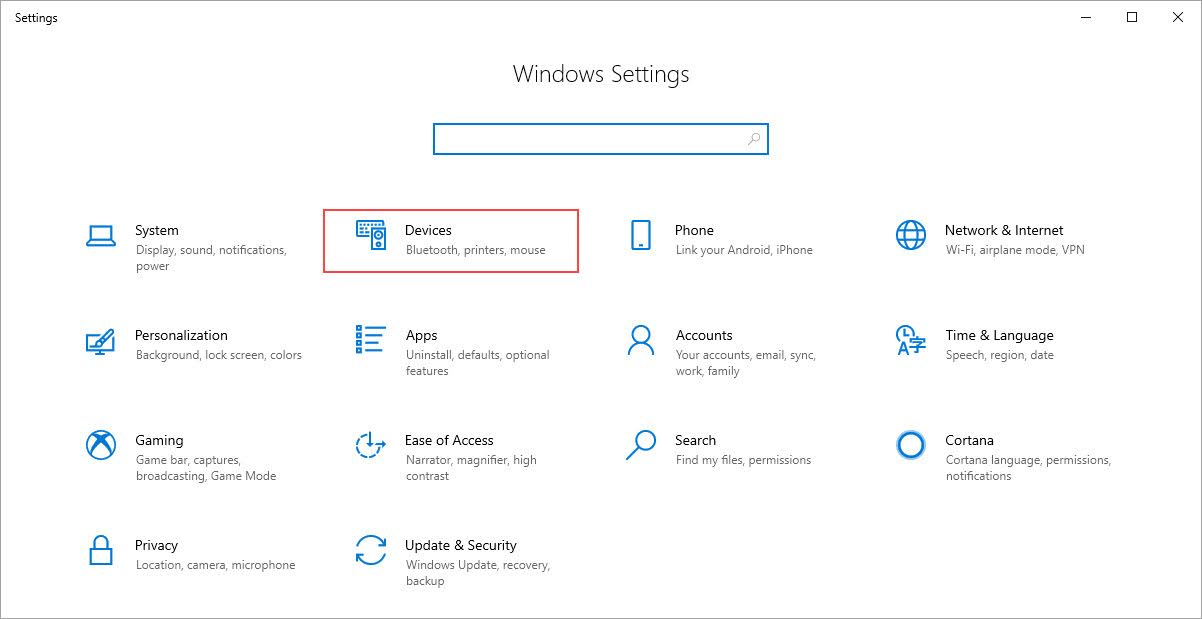 Bước 2: Tiếp đó, các bạn chọn thẻ Devices để thiết lập các thiết bị ngoại vi kết nối vào máy tính Windows 10.