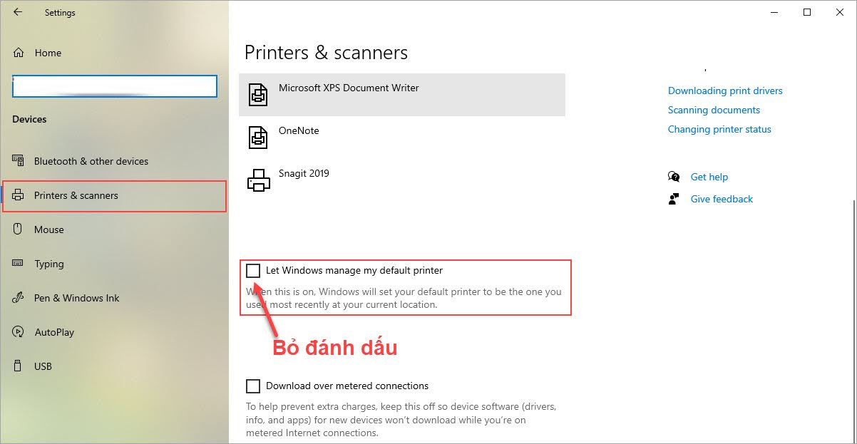 Bước 3: Sau đó, các bạn chọn thẻ Printers & Scanners để thiết lập máy in, máy scan. Các bạn kéo xuống cuối cùng và bỏ chọn mục Let Windows manager my default printer (Cho phép Windows tự động chọn máy in mặc định).