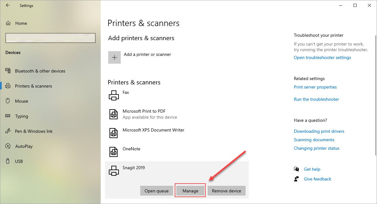 Bước 4: Tiếp theo, các bạn chọn máy in mà mình muốn sử dụng mặc định và chọn Manage.