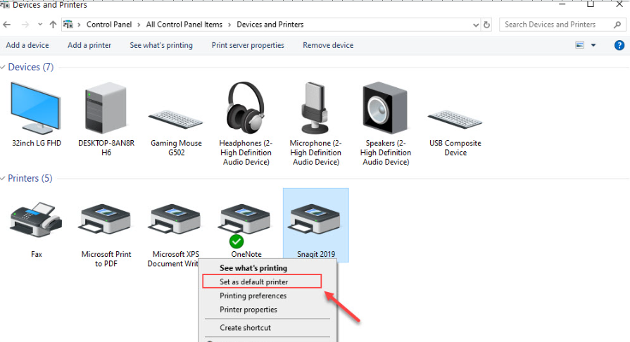 Bước 3: Cuối cùng, các bạn Click chuột phải vào máy in các bạn muốn đặt làm mặc định và chọn Set as default printer.