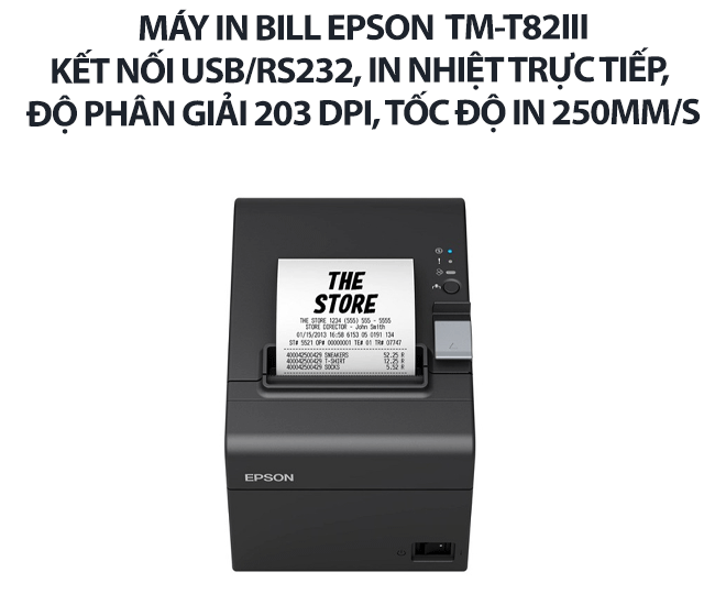 - Máy in Bill Epson TM-T82III (USB+RS232) - Kết nối usb/rs232, in nhiệt trực tiếp, độ phân giải 203 dpi, tốc độ in 250mm/s