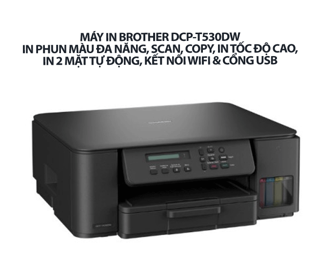 - Máy in Brother DCP-T530DW - In phun màu đa năng, Scan, Copy, in tốc độ cao, in 2 mặt tự động, kết nối Wifi & cổng USB
