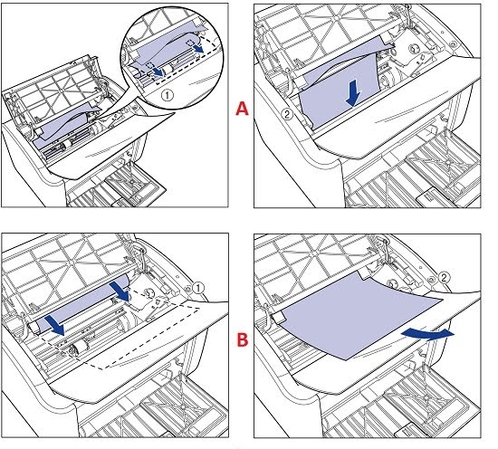 - A: Kéo phần cuối của tờ giấy ra như trong sơ đồ (1), sau đó giữ chặt hai mép giấy và từ từ đưa giấy xuống để lấy giấy ra khỏi máy in (2).