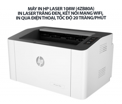 Máy in HP Laser 108W (4ZB80A) – In laser trắng đen, kết nối mạng WiFi, in qua điện thoại, tốc độ cao 20 trang/phút – Giải pháp in ấn nhanh chóng, chất lượng cho văn phòng hiện đại
